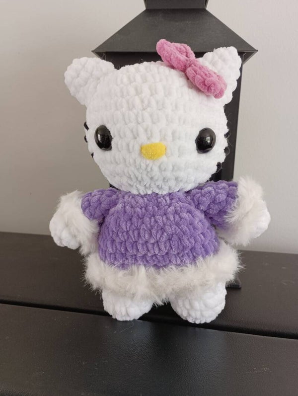 Kitty d'environ 20 cm (sans les oreilles), réalisé au crochet en laine chenille.